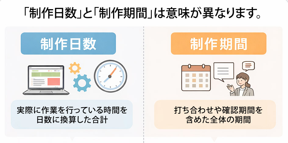 一方「制作期間」は、打ち合わせや確認期間を含めた全体の期間です。